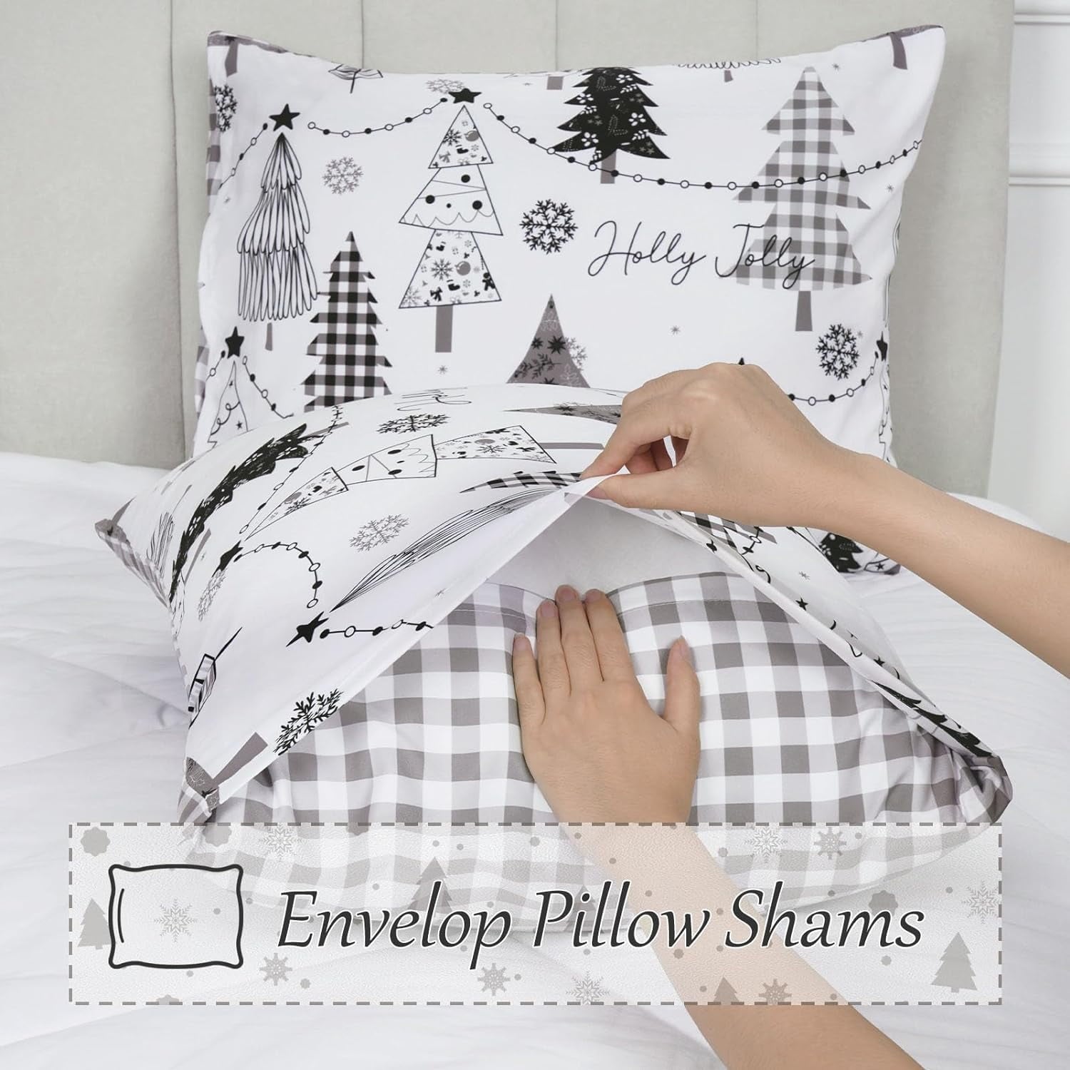 - REVERSIBLE STYLE:Christmas tree duvet cover set is a unique reversible design, practical and beautiful. A side: snowflakes, Xmas trees design, add a strong festive atmosphere to your room; B side: classics buffalo plaid elements ,washable and does not fade.