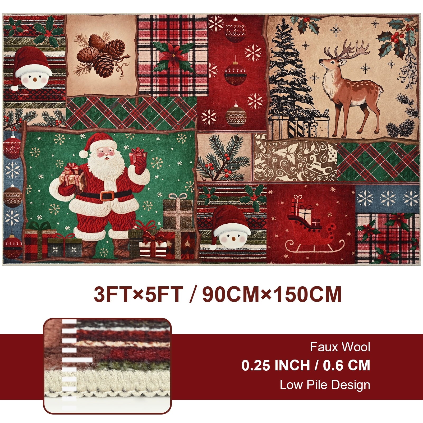 - Christmas Rug 3x5: The Christmas rug for living room blends vintage patchwork aesthetic and classic Santa Claus, reindeer, buffalo plaid elements, filled with a rich and nostalgic Christmas vibe, evoking warm memories of winter holidays. Perfect Christmas decorations