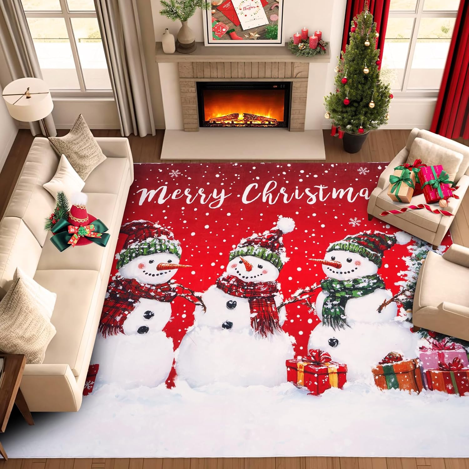 BLEUM CADE Christmas 3x5 ft Area Rug for Living Room Bedroom,Xmas Snowman Rugs Carpet for Bedroom Living Room,Non Slip Washable Area Rug for Christmas Decorations,Red