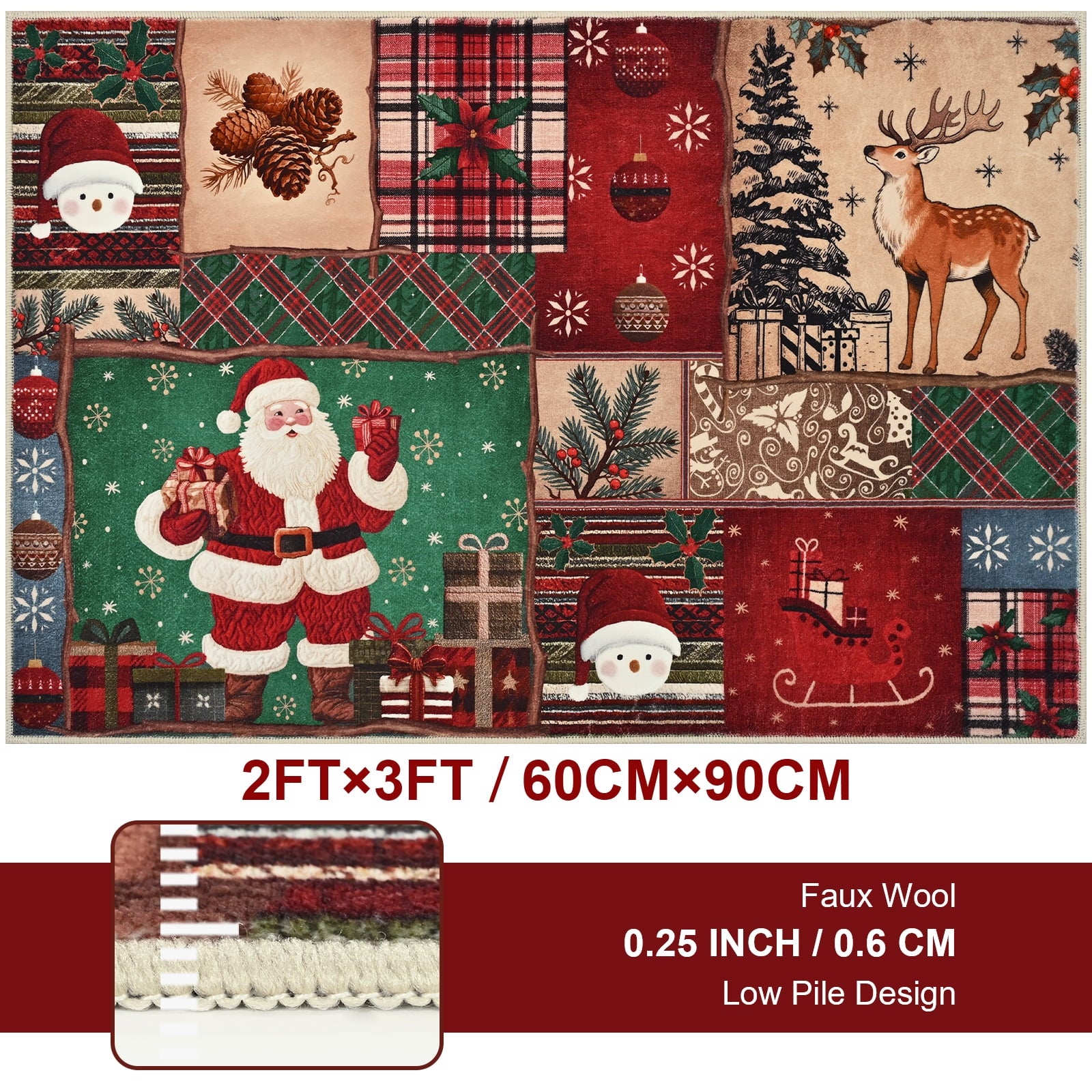 BLEUM CADE Christmas Area Rug 2x3 Washable Rug Non Slip, Santa Claus Door Mat Outdoor Indoor, Soft Faux Wool Patchwork Entryway Rugs Low Pile for Entrance, Christmas Decorations