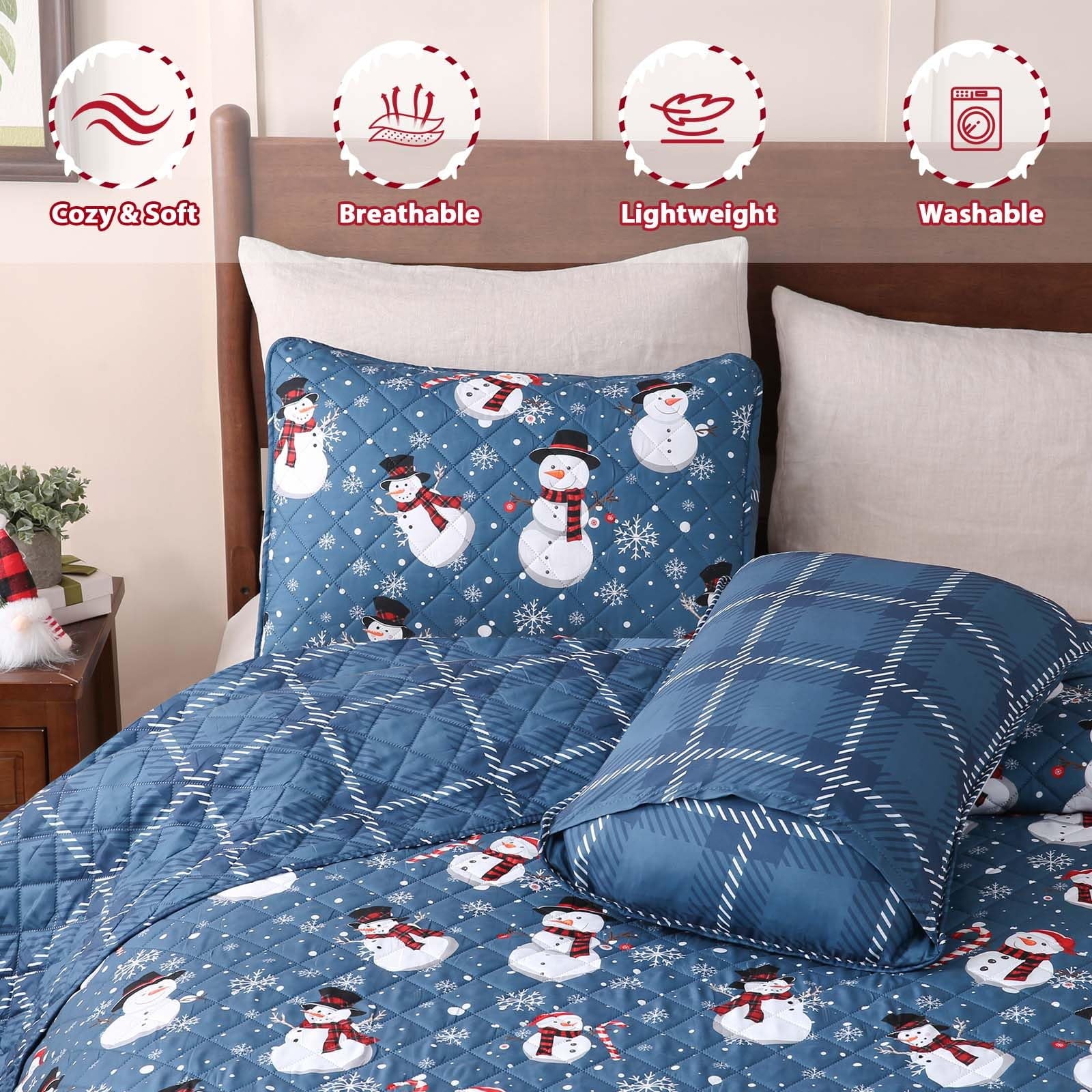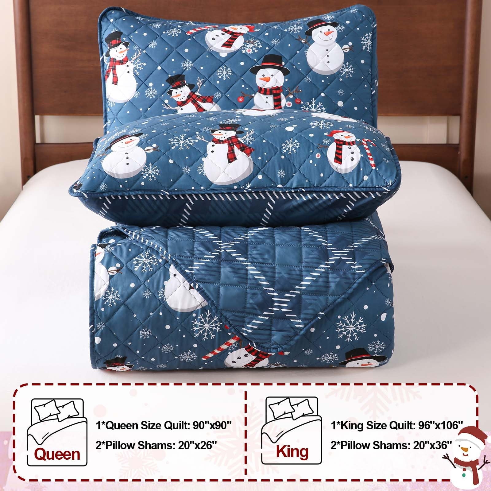 BLEUM CADE Christmas Quilts Sets Queen Size,3 Pieces Christmas Snowman Quilt Bedding Set, Reversible Blue Buffalo Plaid Comforter Sets, Christmas Tree Soft Lightweight Xmas Bedspread Coverlet,90"x90"