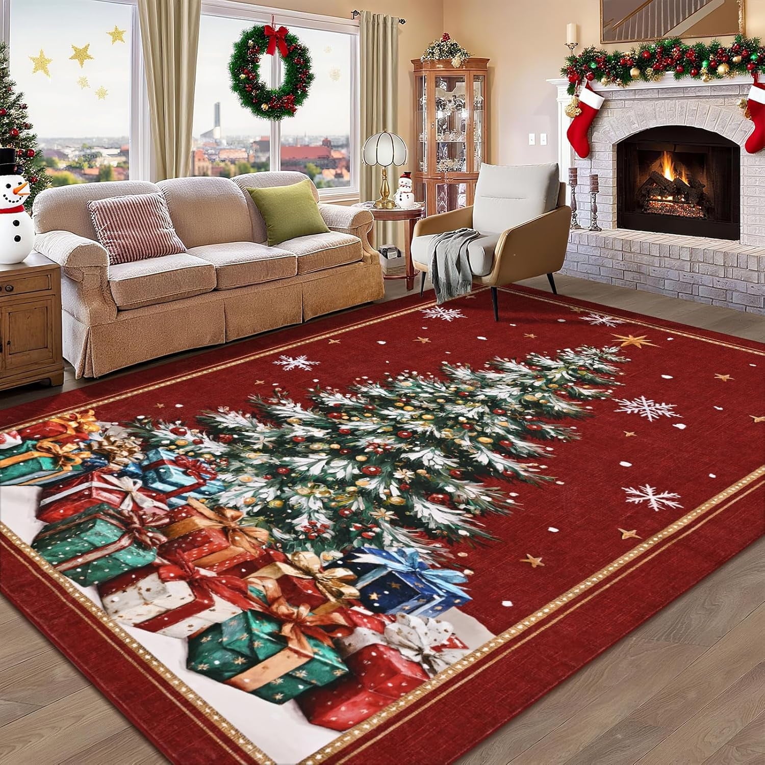 - Christmas Rug 3x5: The Christmas rug for living room adopts classic vintage red texture background, blends classic Christmas elements such as Christmas tree, gift boxes and snowflakes, makes your home more Christmassy this winter. Perfect Christmas decorations